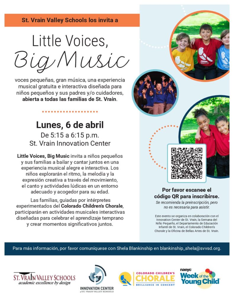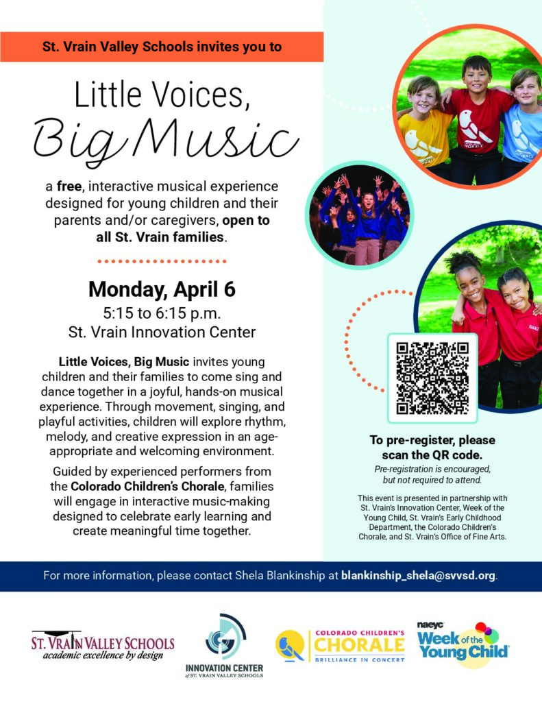 St. Vrain Valley Schools invites families to Little Voices, Big Music, a free interactive musical experience for young children and their caregivers on Monday, April 6 from 5:15 to 6:15 p.m. at the Innovation Center in Longmont. Guided by experienced music educators, children will explore rhythm, melody, and creative expression through singing, movement, and hands-on musical activities. The evening celebrates early learning through music and provides families with fun ideas to continue musical exploration at home. Click here to pre-register