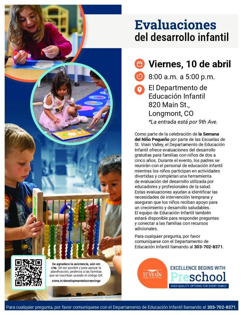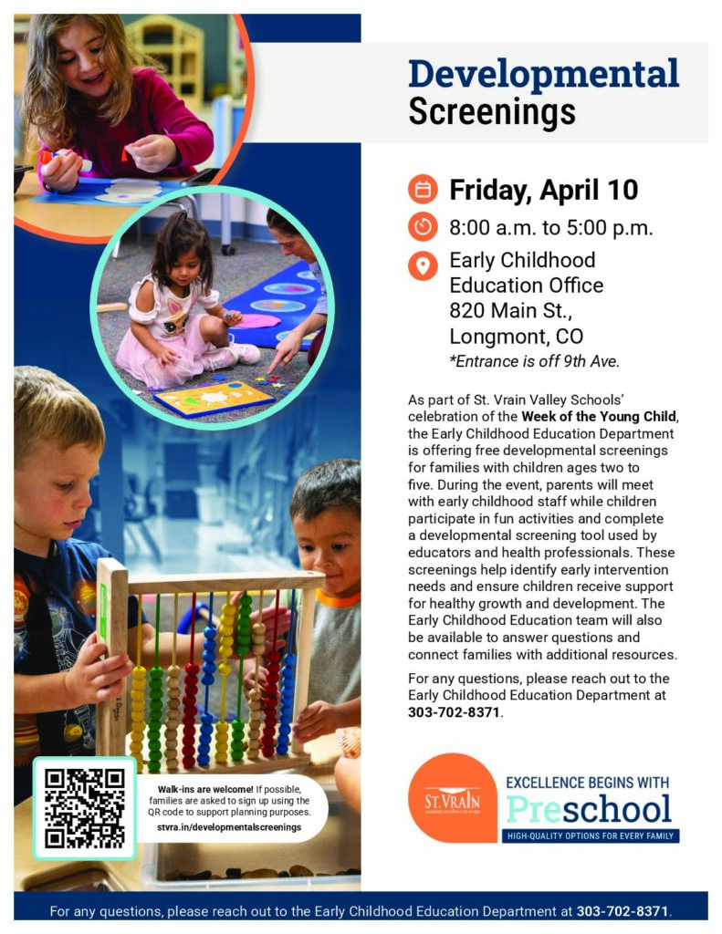 The Early Childhood Education Department is offering free developmental screenings for children ages 2–5 on April 10 from 8:00 a.m. to 5:00 p.m. at the Early Childhood Education Office in Longmont. Families will meet with early childhood specialists while children participate in fun activities that support a simple screening designed to help identify early learning needs and connect families with helpful resources. Walk-ins are welcome, though families are encouraged to sign up in advance to support planning. Sign Up Here