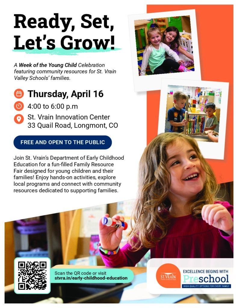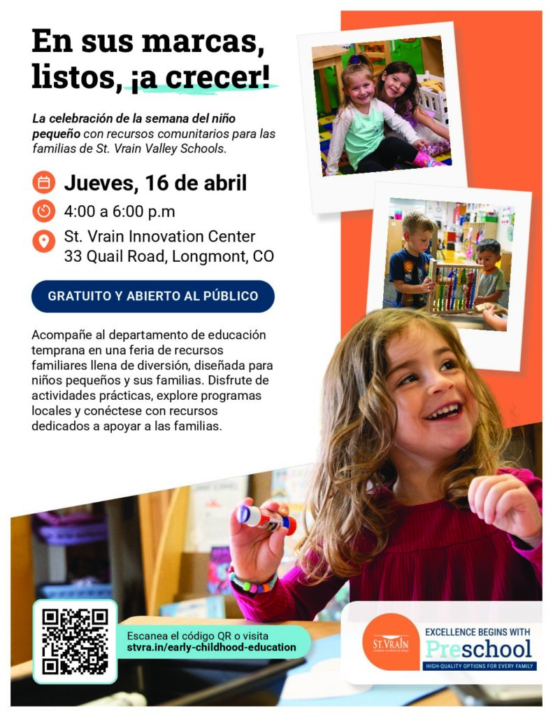 St. Vrain’s Department of Early Childhood Education invites families to a fun-filled Family Resource Fair celebrating the Week of the Young Child. Families with young children are invited to enjoy hands-on activities, explore local programs, and connect with community resources on Thursday, April 16 from 4:00-6:00 p.m. at the St. Vrain Innovation Center, 33 Quail Road, Longmont. Learn More.